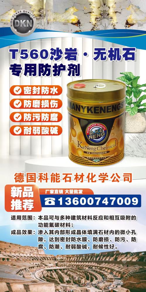發(fā)布信息: T560沙巖·無機石專用防護劑 密封防水 防磨損傷 防污防腐 耐弱酸堿 德國科能石材化學公司 廠家直銷大量批發(fā) 新品推薦 13600747009 適用范圍:本品可與多種建筑材料反應和相互吸附的 功能氟碳材料; 成品效果:滲入其內(nèi)部形成晶體填滿石材內(nèi)的微小孔 隙,達到密封防水膜、防磨損、防污、防腐、防潮、耐弱酸堿,耐候性好。